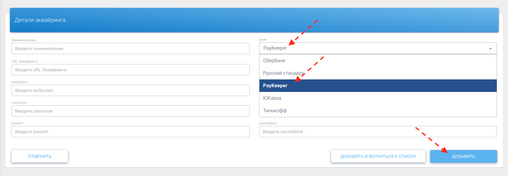 Выбираете эквайринг "Paykeeper" в выпадающем поле