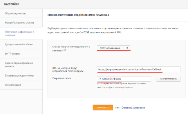 В пункте “URL, на который будут отправляться POST-запросы” нужно прописать адрес “https://pp-paykeeper.e-da.site/Payment/Callback”