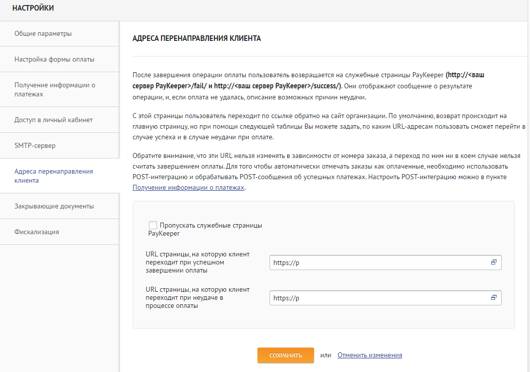 Также в настройках личного кабинета нужно прописать адреса перенаправления клиента в соответствующем разделе.