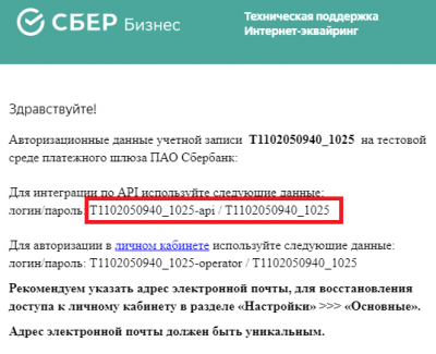 - данные которые нам необходимы из письма от Сбербанк «логин …-api/ пароль….» (пример, письма Рис.1) Рис.1