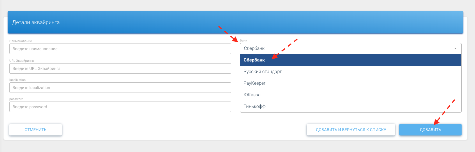 Выбираете эквайринг "Сбербанк" в выпадающем поле