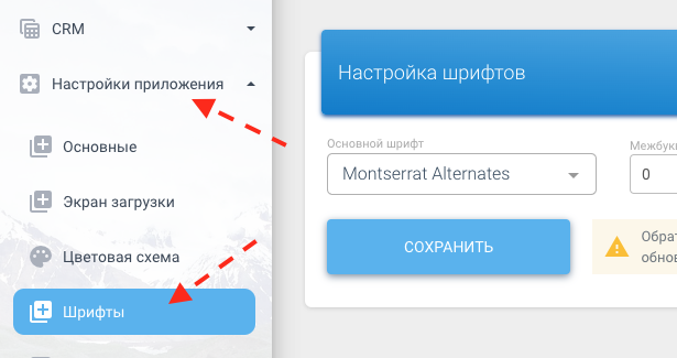 Для того, чтобы выбрать шрифт, перейдите во вкладку «Настройки приложения» в меню слева. Затем нажмите на «Шрифты».