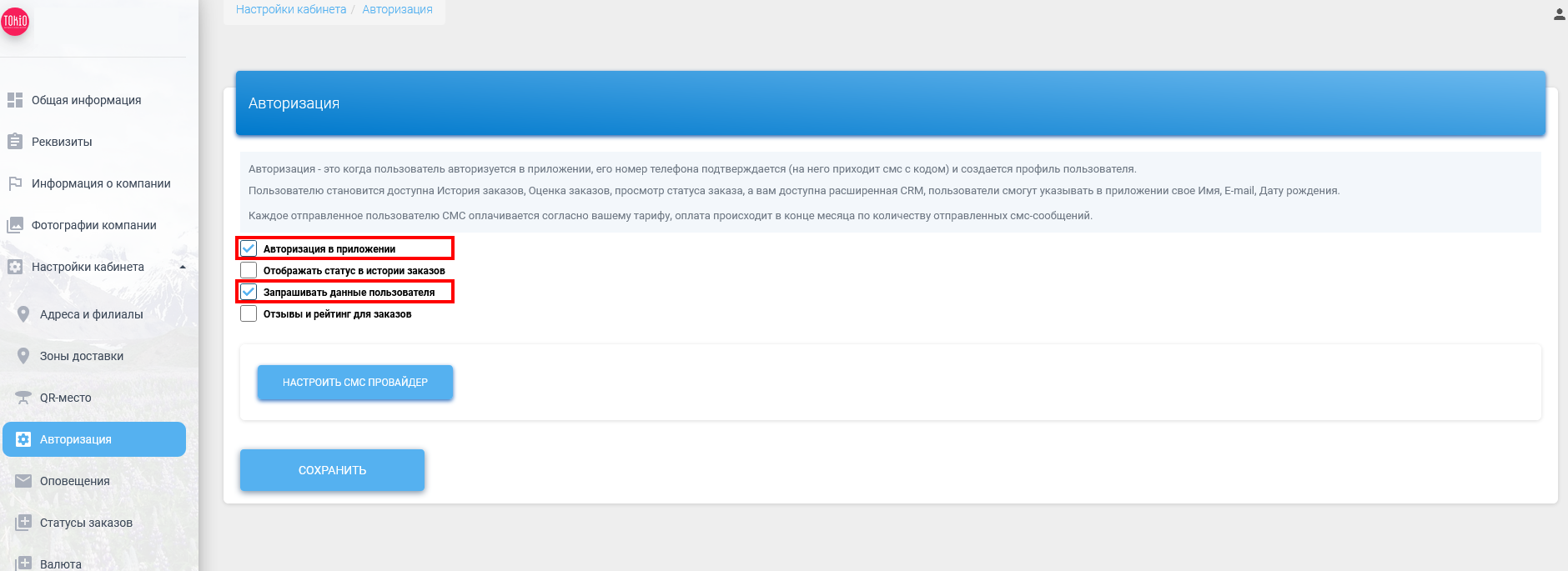 - Перейти в подраздел «Авторизация» в разделе «Настройки кабинета»