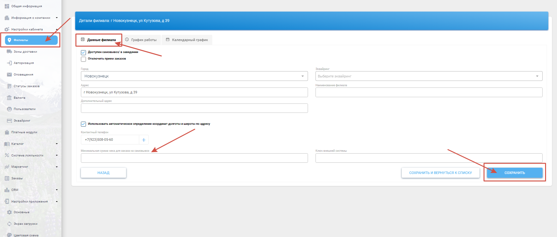 В открывшемся окне в строке "Минимальная сумма чека для заказа на самовывоз" введите необходимую сумму. Далее нажмите "Сохранить".