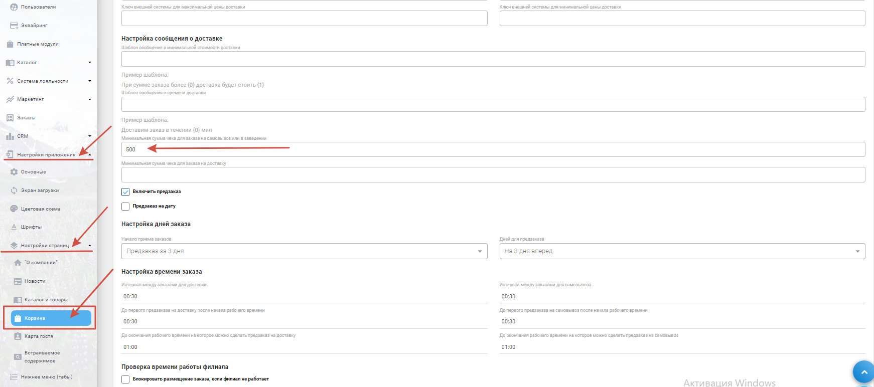 Так же данное ограничение можно настроить для всех филиалов сразу в разделе "Настройка приложения" – "Настройка страниц" – "Корзина".