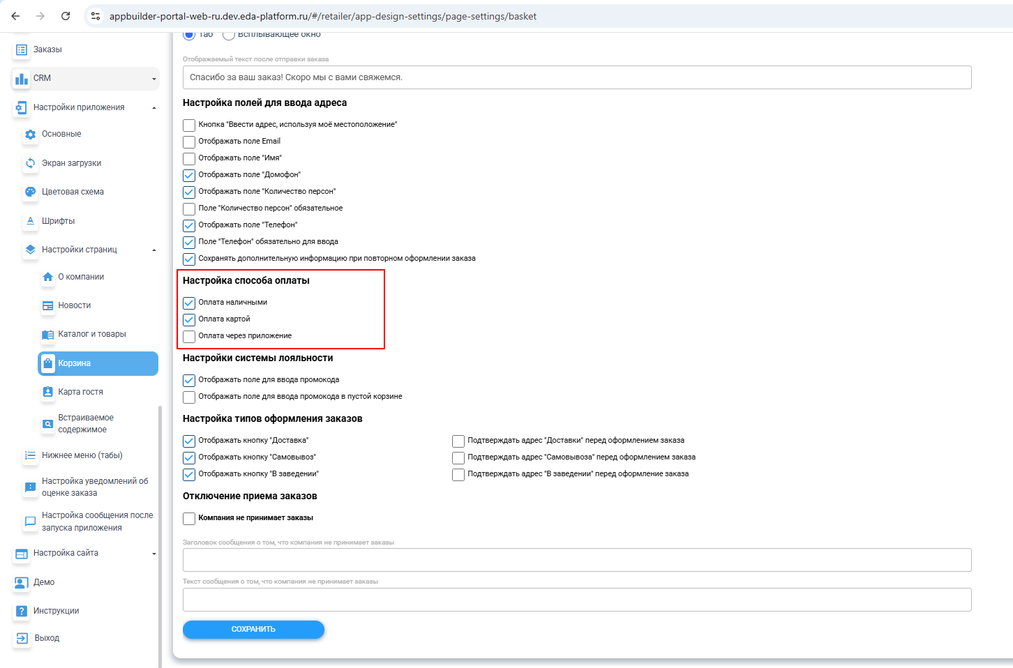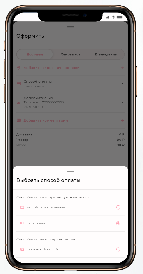 Способы оплаты будут отображаться пользователю в приложении при создании заказа.