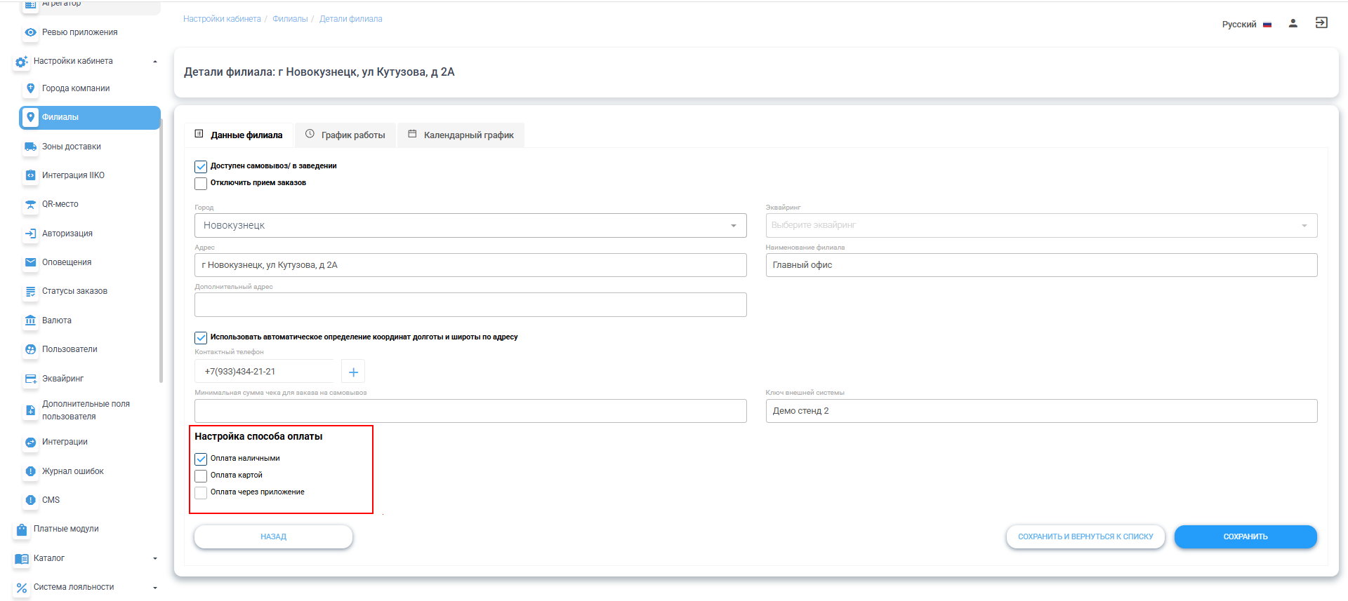 Способ оплаты будет доступен в филиале, только если он включен глобально и включен для филиала.