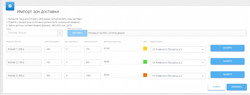 - Каждая зона должна называться именем или адресом филиала, который туда доставляет