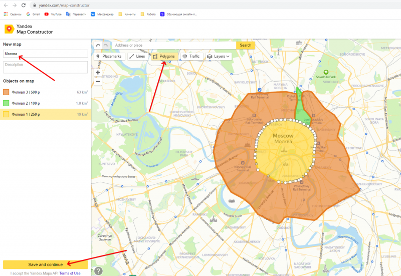 - С помощью инструмента «Полигон» или «Polygons» создать несколько зон, выделить их разным цветом