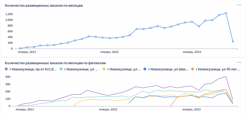 - «Количество размещенных заказов» и «Количество размещенных заказов по дням» - отображают информацию по количеству заказов, сделанные клиентами через приложение.