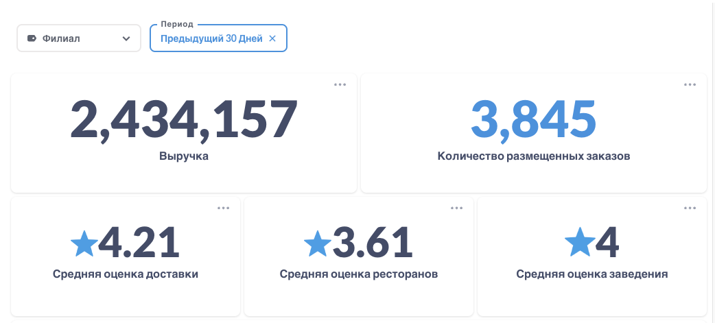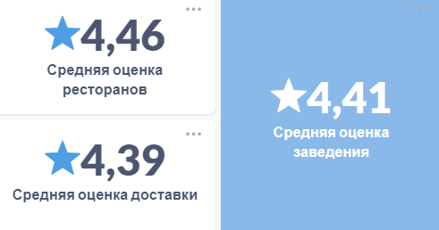 - Компоненты «Средняя оценка ресторана», «Средняя оценка доставки» и «Средняя оценка заведения» - компоненты отражают рейтинги заведения по оценкам, выставленным в мобильном приложении клиентами. Средняя оценка ресторанов определяется для заказов с самовывозом или в самом заведении, а для средней оценки доставки собирается рейтинг заказов с доставкой. Средний рейтинг оценки заведения определяется по всем заказам с оценкой.