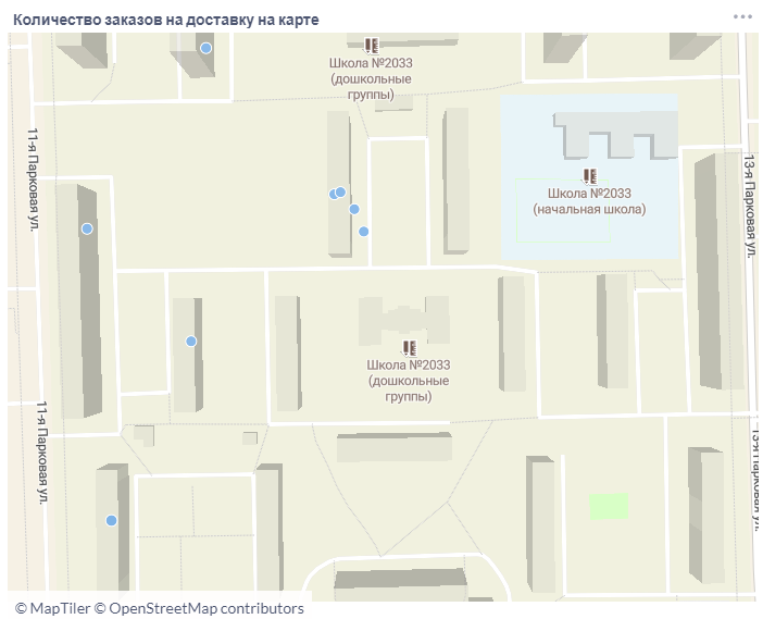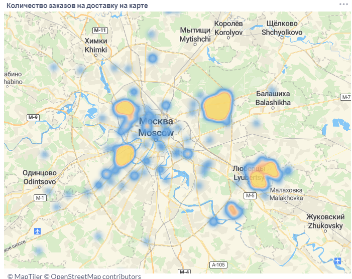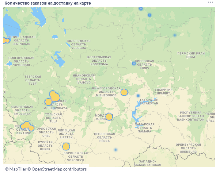 - «Количество заказов на доставку на карте» - этот компонент представляет собой карту нагрева, на которой указаны места доставок, чем больше точек расположенных рядом, тем ярче и крупнее точки. Этот компонент можно увеличивать, просматривая адреса заказов более детально.
