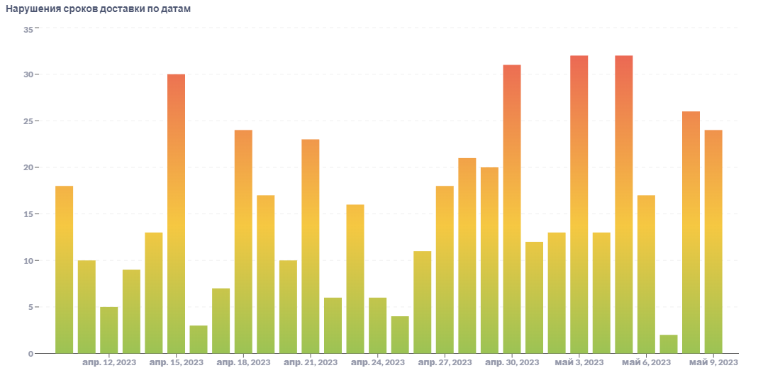 - «Нарушение сроков доставки по датам» - график, отображающий все нарушения сроков доставки по датам по заказам с градиентом.