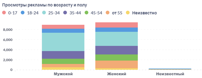 - «Просмотры рекламы по возрасту и полу» - компонент аналогичный с «Просмотры рекламы по возрасту», но с дополнительной группировкой по полу целевой аудитории. В данный момент информация собирается только из Yandex.Direct.