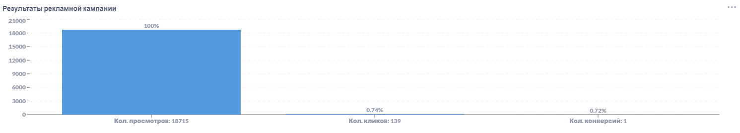 - «Результаты рекламной кампании» - график с переходом, который показывает результаты рекламной кампании. Первая колонка представляет собой количество просмотров рекламы, вторая колонка это количество кликов, а третья это количество конверсий (цель рекламной кампании, например установка приложения или покупка определенного товара и т.д.). Сверху над колонками есть переходящий процент - т.е. если над второй 0.74%, то это означает что из 100% пользователей 0.74% кликнули на рекламу. Также действует и с конверсиями - 0.72% пользователей из 100% кликнувших по рекламе выполнили целевое действие.