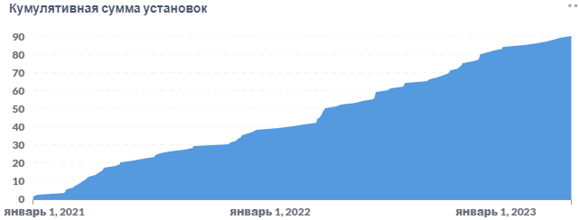 - «Кумулятивная сумма установок» - этот компонент отображает суммарную сумму установок по каждому дню. Например: если 10 марта было 10 установок приложений и до этого установок не было, то суммарное количество установок в этот день равно 10, если 11 марта было еще 12 установок, то суммарное количество установок в этот день уже равняется 22 и т.д.