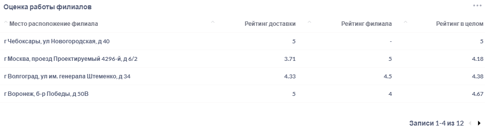 - «Оценка работы филиалов» - компонент представляющий рейтинги отдельно по всем филиалам заведения, работает аналогично трем предыдущим компонентам.