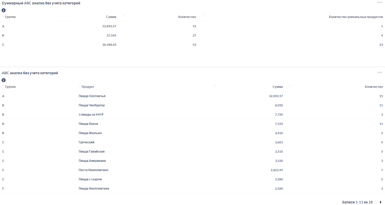 - «Количество уникальных товаров» (только для суммарных значений) - обозначает количество уникальных товаров в категории, т.е. не все проданные товары, а конкретно их наименование. Например: Суммарное количество проданных товаров в группе B = 27, но в нее входи 4 уникальных продукта - «Пицца Чизбургер», «3 пиццы за 999 ₽», «Пицца Бекон» и «Пицца Жюльен».