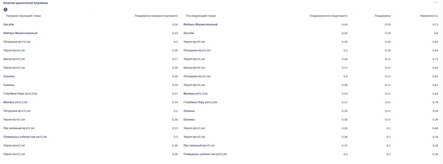 Здесь есть только один компонент «Анализ рыночной корзины», который представляет собой таблицу с информацией по анализу покупательской корзины. У компонента имеются следующие поля: