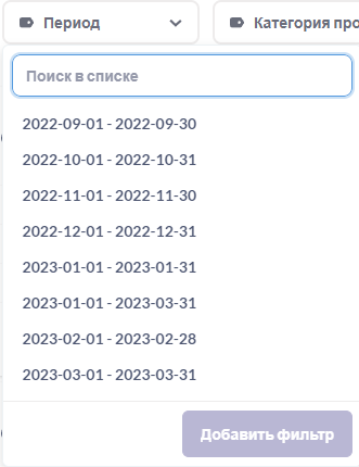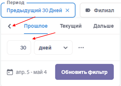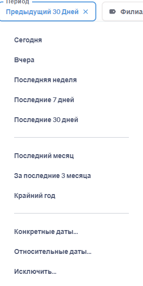 - «Период» - фильтр выбора временного периода, по умолчанию равно «Предыдущие 30 дней». Значение можно поменять нажав на компонент и поменять значение в поле ввода, а после нужно нажать на кнопку «Добавить фильтр». Также можно поменять тип выбора периода, нажав на стрелочку в фильтре слева вверху.