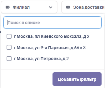 - «Филиал» - фильтр выбора филиала, по которому нужно отфильтровать информацию. По умолчанию пуст, если нажать на компонент, то в выпадающем списке можно выбрать какие филиалы отобразить нажатием по их местам расположения, а после нажать на кнопку «Добавить фильтр».
