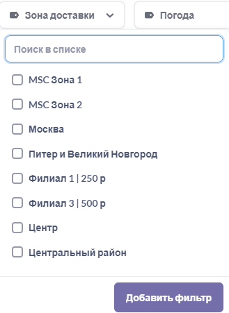 - «Зона доставки» - поле для выбора зоны доставки, по которым будут отфильтрованы значения. По умолчанию фильтр пуст, но при нажатии на него, откроется выпадающий список, в котором перечислены зоны доставок, по которым можно отфильтровать данные.