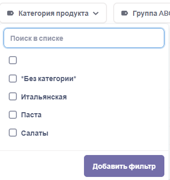 - «Категория продукта» - это фильтр по категориям продукта, которая была указана ему в конструкторе приложений.