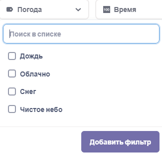 - «Погода» - фильтр погоды. По умолчанию фильтр не установлен, при нажатии на компонент откроется список погоды, по которому можно отфильтровать данные.