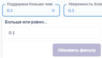 «Поддержка больше чем» - фильтр значений по полю «Поддержка». По умолчанию в значении 0.1, т.к. значения меньше являются не объективными.