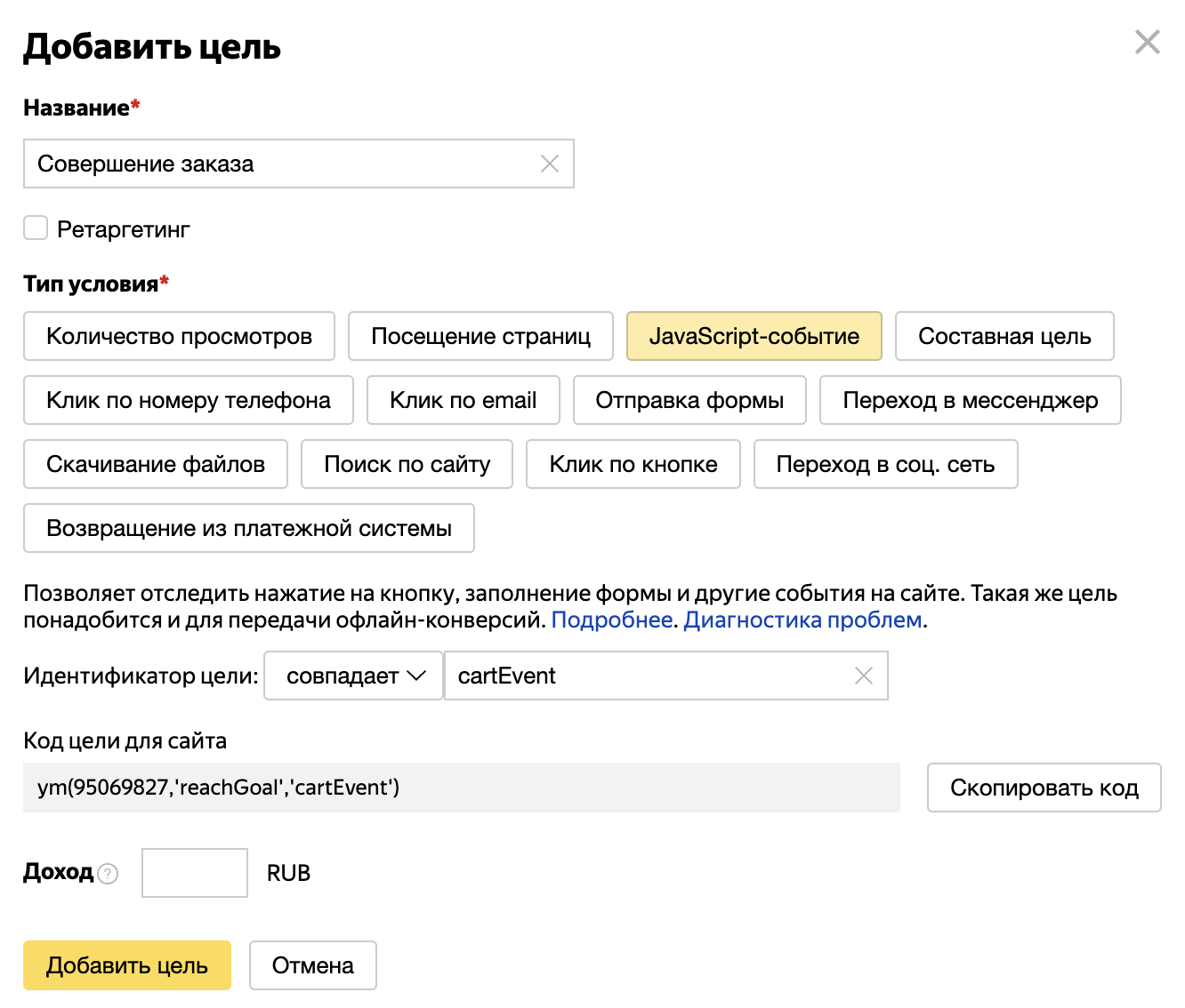Конверсионная – цель, которая не используется в качестве условия ретаргетинга в Директе.Нажмите на кнопку Добавить цель.