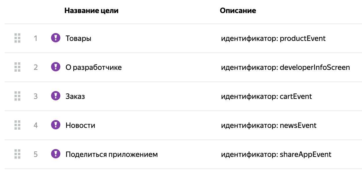 Для каждой цели приложение формирует и передаёт определённый набор данных. В Яндекс Метрике эти данные называются параметрами визита. Далее приведён список параметров визита по каждой цели.