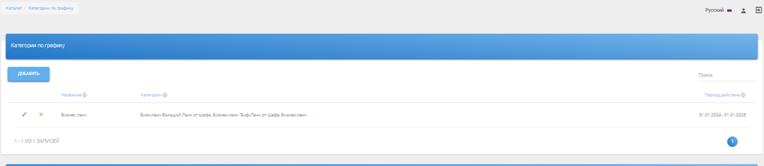 Для редактирования "Категории по графику" на платформе выберите раздел "Каталог" и нажмите вкладку "Категории по графику", затем необходимо нажать на редактирование (символ карандаша)