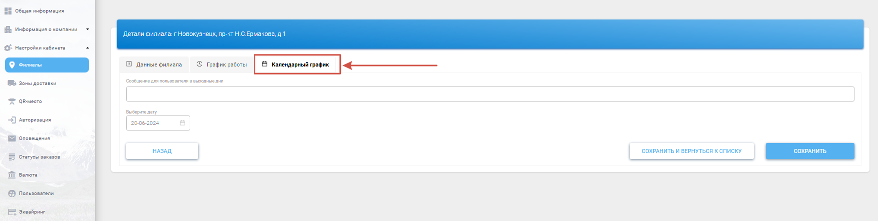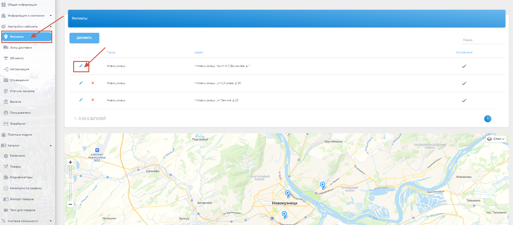 Заходим в раздел "Настройки кабинета" - "Филиалы", затем необходимо нажать на редактирование (символ карандаша)