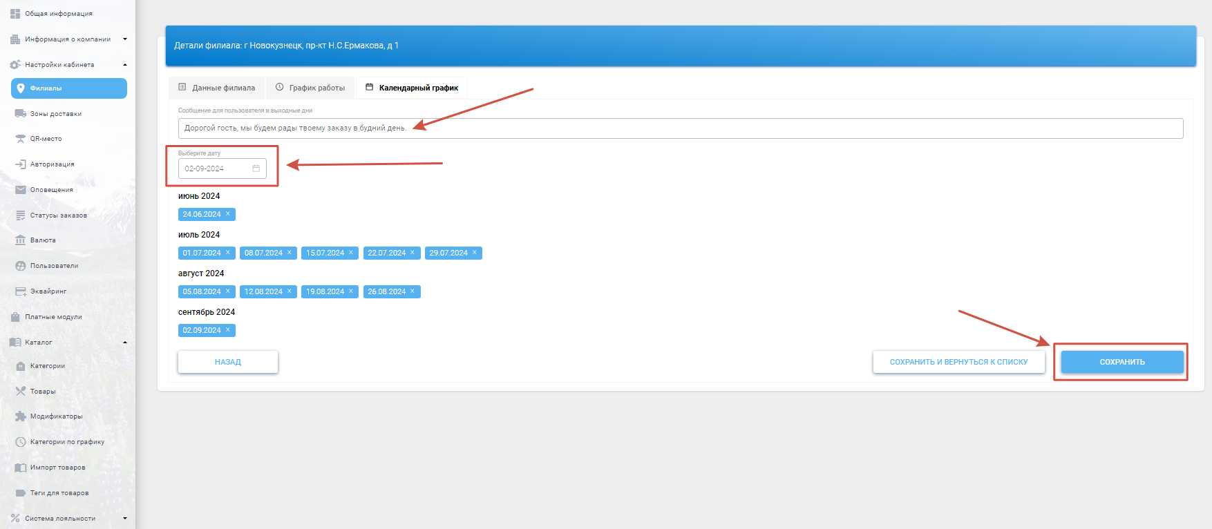 Вводим сообщение пользователю, которое высветится ему в выходные дни. И настраиваем дни дополнительных выходных среди недели. Например, если у Вас выходной у компании каждую неделю в понедельник. В окне "Выберите дату" выберите все понедельники и введите сообщение для пользователя, например, "Дорогой гость, мы будем рады твоему заказу в будний день." и не забываем сохранить настройки прежде выйти из раздела.