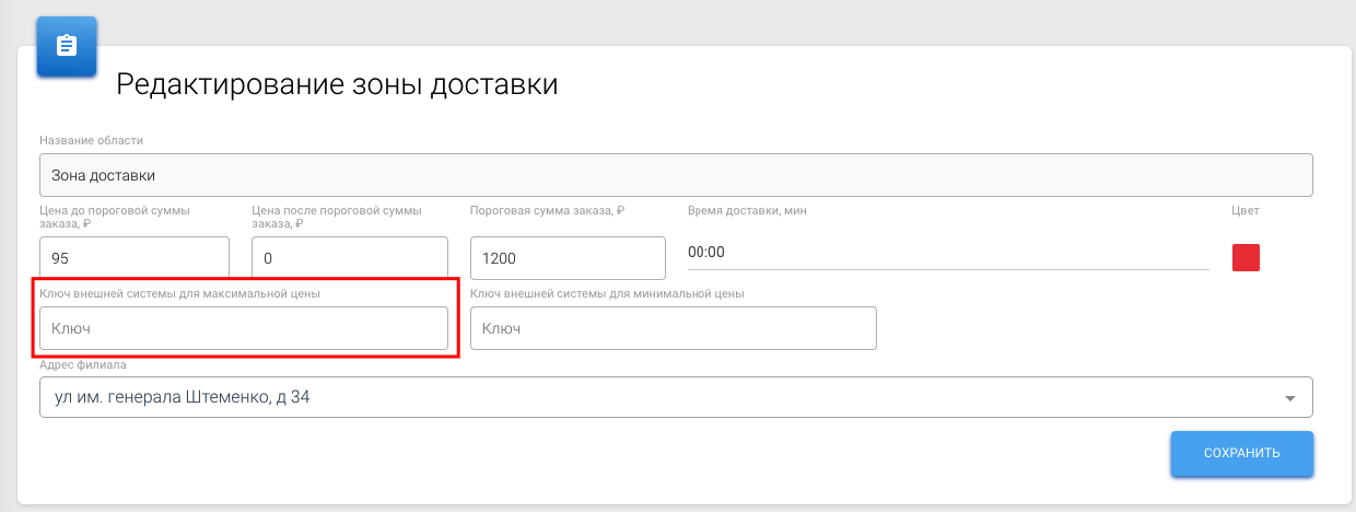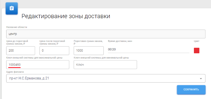 - Артикул этой услуги нужно добавить в поле "Ключ внешней системы для максимальной цены" во вкладке "Зоны доставки"