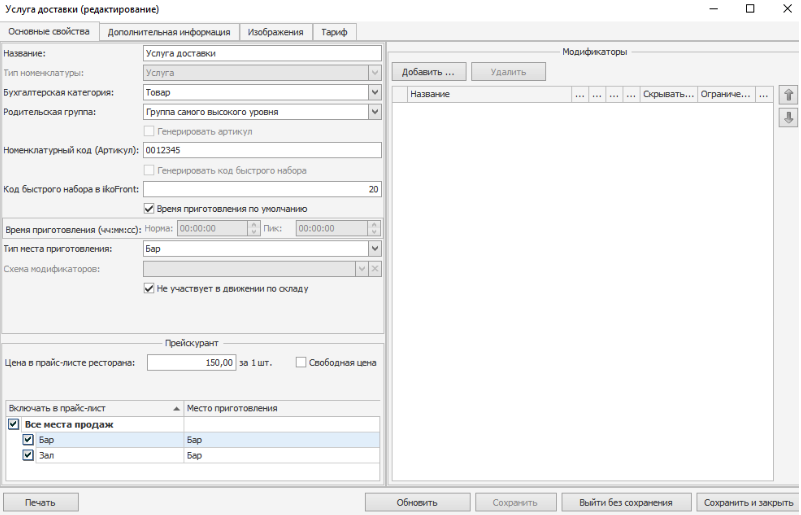- В iikoOffice создать услугу на доставку