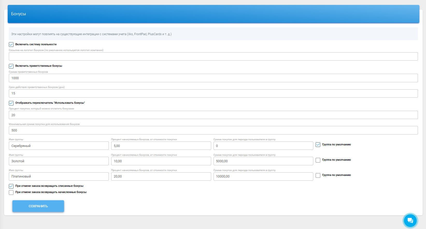 Бонусная система не поддерживает работу вместе с системой лояльности от систем интеграции (iiko, frontpad, PlusCards и т.д).