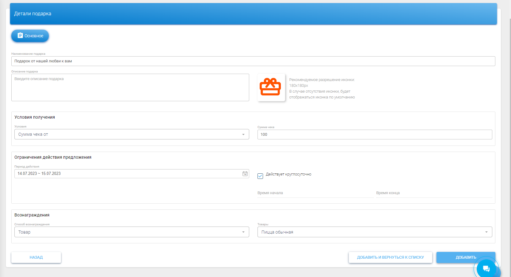 - Если подарок действует круглосуточно, то поставьте в поле галочку. Если нет, то заполните время начала и время конца действия подарка.