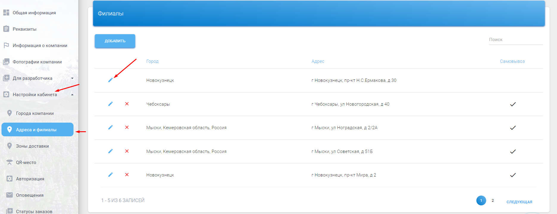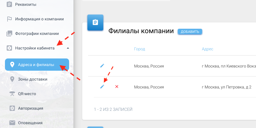- Выберите редактирование (кнопка карандашика) нужного филиала