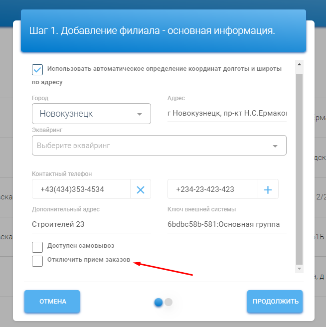 Откроется окно редактирования данных филиала, в котором нужно будет активировать функцию: «Отключить прием заказов»: