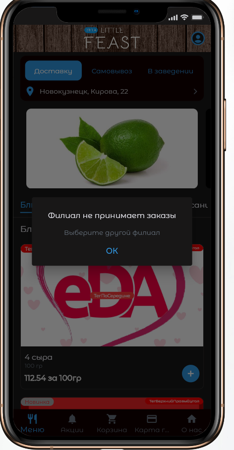 Важно! В данном примере, функция: «Отключение заказов» активна у головного филиала, для которого отключен самовывоз. Поэтому, нужно указать адрес доставки. В ином случае, если самовывоз доступен головному филиалу, МП изначально уведомляет пользователя о неработоспособности филиала.