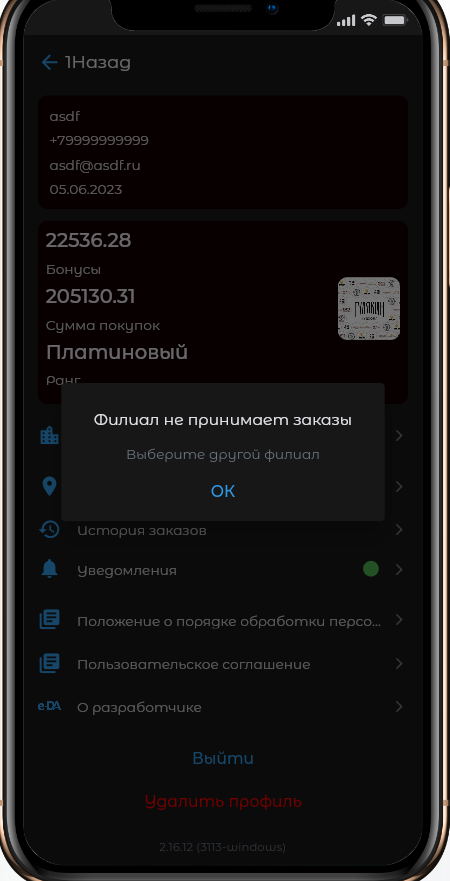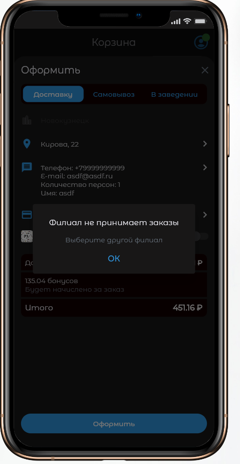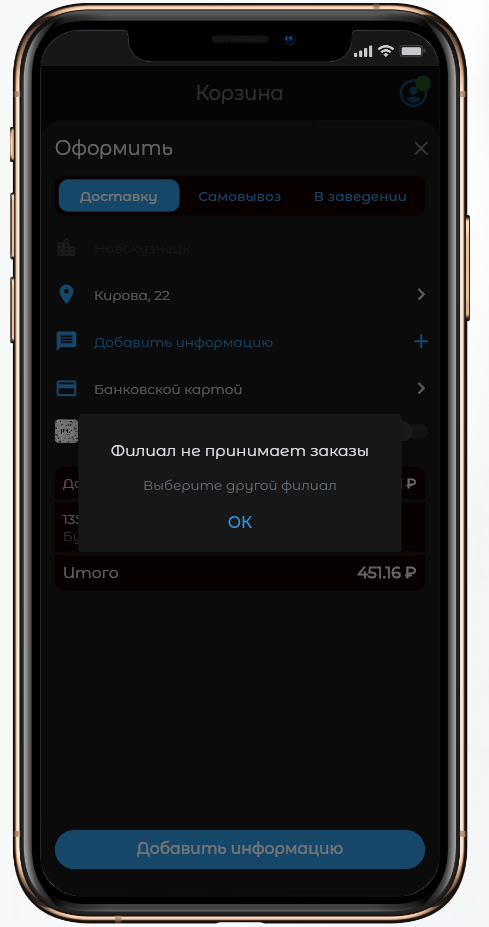 Чтобы проверить, как это будет выглядеть в готовом варианте, перейдите в веб-версию приложения и оформите заказ в нужном филиале. Если перед оплатой заказа появилось окно с сообщением, которое вы написали в описании работы филиала, то вы всё сделали правильно.