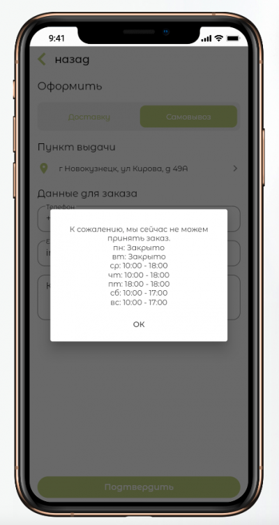 После введения адреса, МП уведомит пользователя о том, что филиал не принимает заказы.