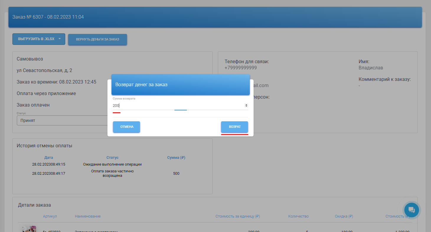 - В появившемся окне указать сумму на которую небоходомо сделать возврат и нажать «Возврат»