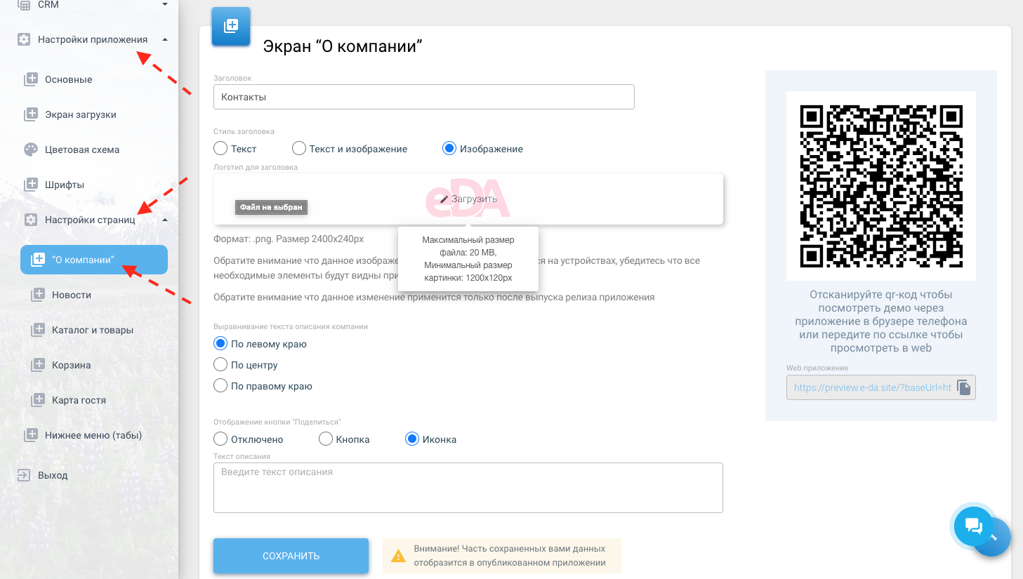 - Формат - .png, .jpg. Для того, чтобы установить шапку приложения, перейдите в модули «О компании», Новостей, Списков товаров, Карты гостя и Корзины.