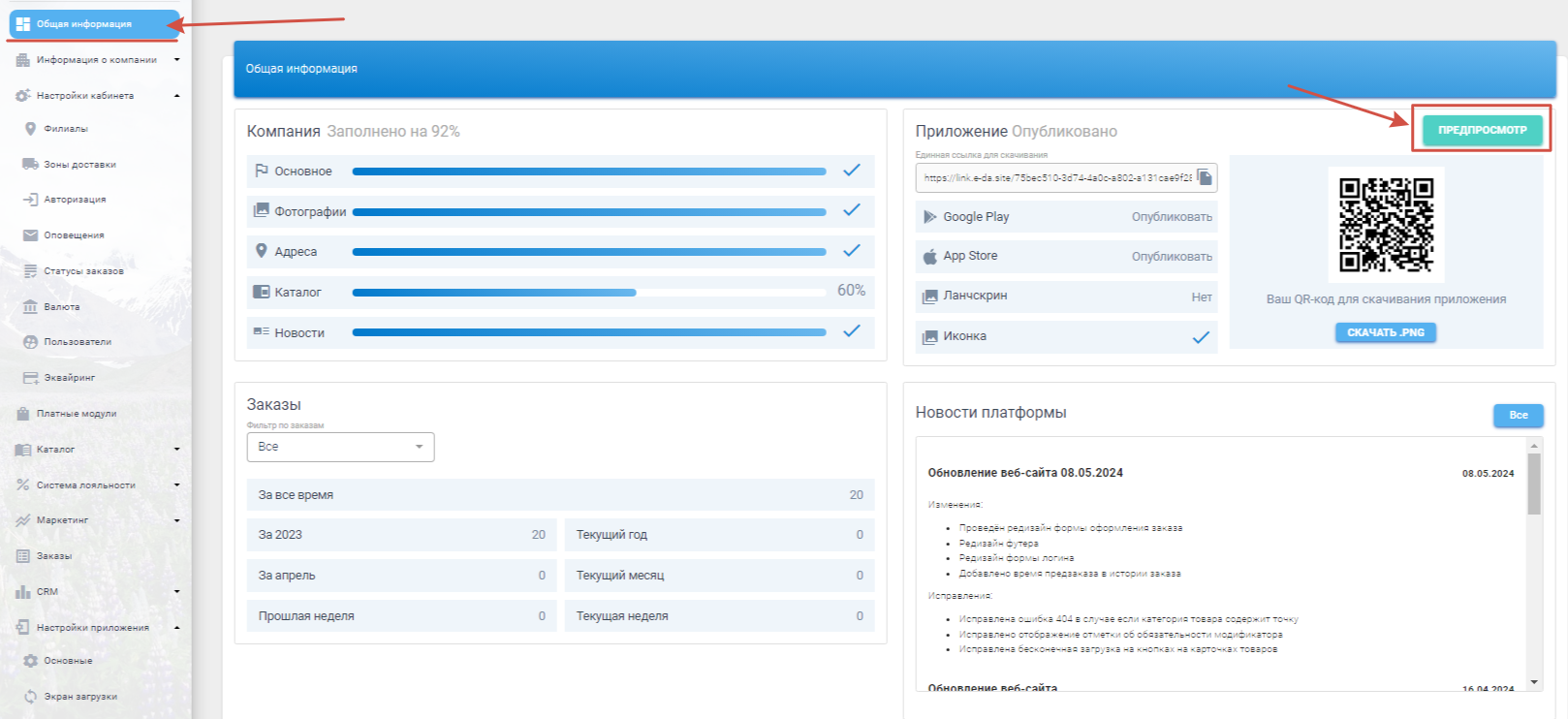Можно проверить отображение в МП предзаказа в разделе «Общая информация» кнопкой «Предпросмотр»