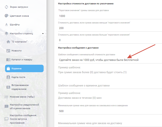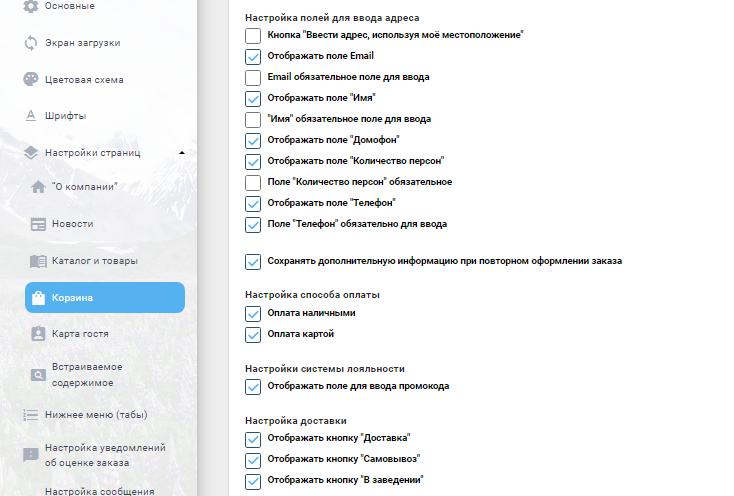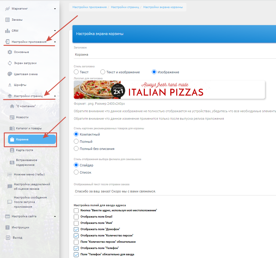 В данном разделе вы можете сделать следующие настройки своего приложения. Для этого зайдите в раздел «Корзина»