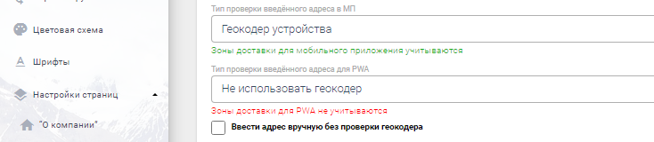 При выборе «Тип проверкии введенного адреса» - «Проверка с помощью геокодирования» адрес, выбранный пользователем, будет проверяться на корректность заполнения. Если возникает проблема, что адрес не всегда распознается у клиента, то можно включить дополнительную настройку «Ввести адрес вручную без проверки геокодера». Это настройка позволит вводить адрес пользователем вручную. Такой адрес не будет проверяться на корректность.