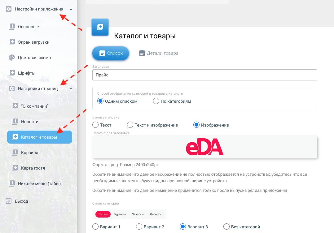 Для того, чтобы перейти к настройке, нажмите «Настройки приложения» в меню слева и перейдите в «Настройки страниц» в раздел «Каталог и товары»