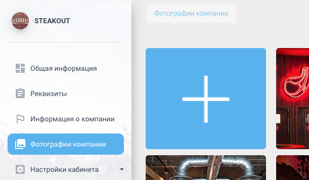 Рекомендуемый размер изображения: 1600×1600 px. Расширение: .png, вес: не более 3 Мб. Изображение загружается во вкладке «Фотографии компании».